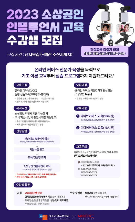 SNS를 통해 누구나 사업을 할 수 있는 시대, 인플루언서 시장 규모가 날로 성장하고 있습니다. 누구나 도전할 수는 있지만 시행착오를 줄이고 소비자의 구매 욕구와 호기심을 자극할 수 있도록 미리 교육을 받을 수 있다면 너무나 큰 도움이 될 것 같은데요. 이 모든 교육과 관련 장비를 무료로 지원받을 수 있는 방법이 있습니다.