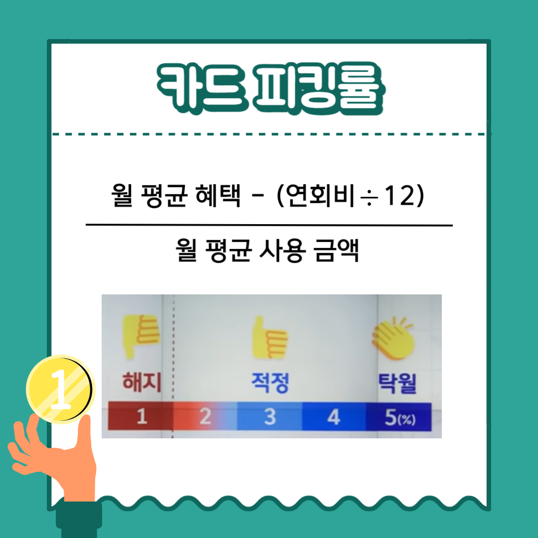 신용카.드가 나에게 맞는 카.드인지 확인하려면 카.드 피킹률을 계산해보면 됩니다. 우리가 월 평균으로 혜택을 받는 금액에서 연회비를 12분의 1로 나눈 값을 빼주고, 월 평균 사용 금액으로 나눠주면 됩니다.
