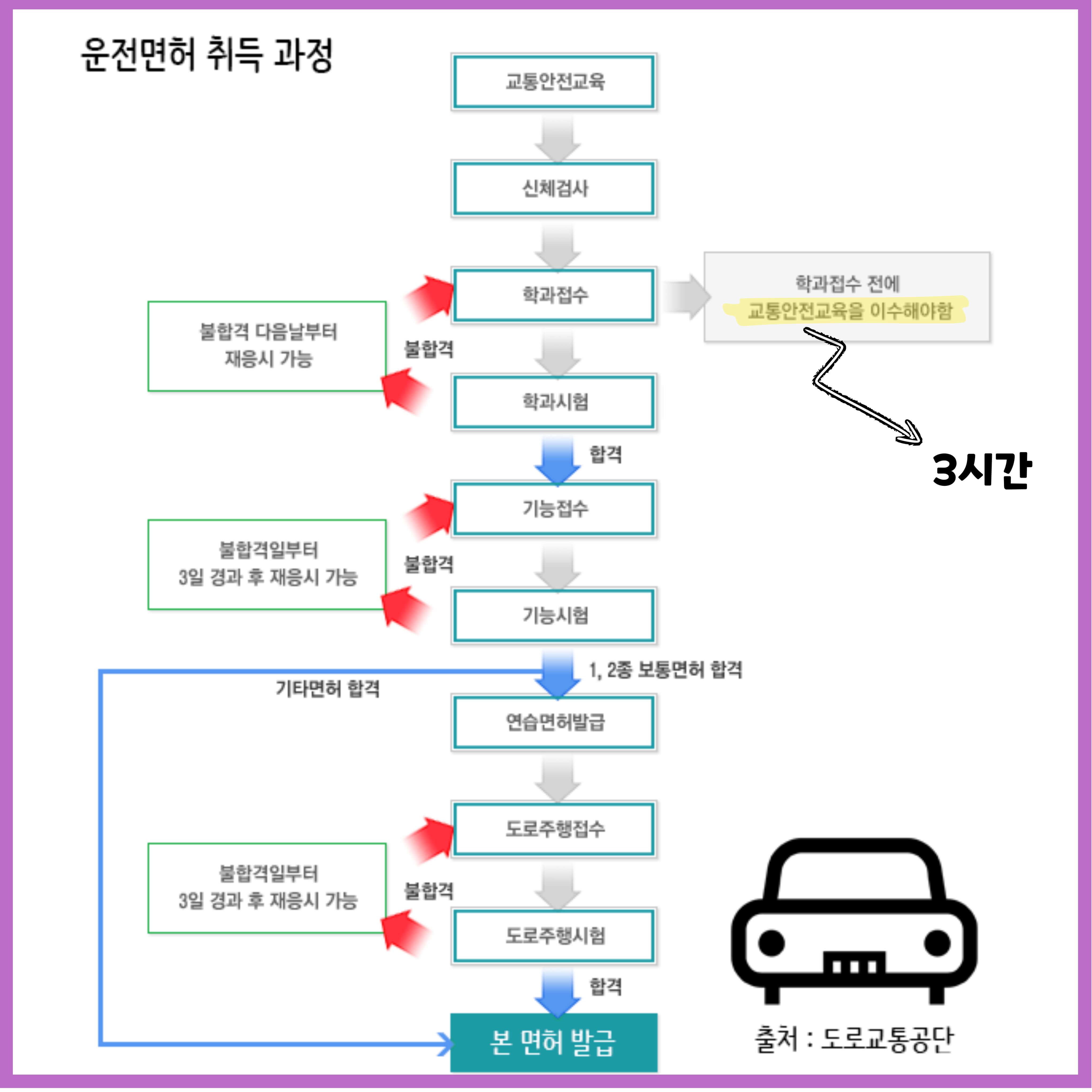 보통 학과 시험은 불합격 시 다음 날부터 재응시할 수 있습니다. 학원 등록 없이 시험장에서 취득하시려면, 시험장이 거주지와 거리가 상당하니, 교통안전 교육과 필기시험을 같은 날로 하시는 것을 추천드립니다.