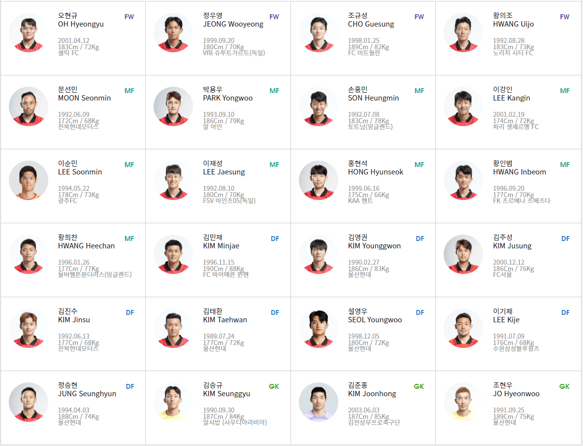 지난 13일과 17일, 시원하게 이긴 대표팀의 사이다 같은 플레이 다들 잘 보셨을 겁니다. 손흥민, 이강인, 조규성 등 스타플레이어들의 여유로운 모습에 애국심까지 샘솟지 않을 수 없는데요. 그동안 진행되어 왔던 일정과 차후 월드컵 / 아시안컵 일정들, 그리고 기대를 한 몸에 받고 있는 대표팀의 명단과 기존 월드컵과 아시안컵에서의 성적에 대해 정리해 보겠습니다.