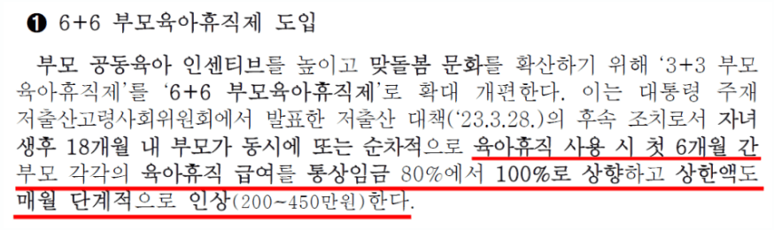 24년부터 6+6 부모 육아 휴직 제도가 도입됩니다. 기존 생후 12개월에서 18개월 이내 자녀로 지원 대상이 확대되었고, 부부가 동시 혹은 순차적으로 육아 휴직 제도를 사용하게 되면, 육아 휴직 상한액을 기존 200 ~ 300만 원에서 최대 200 ~ 450만 원으로 확대 지원해 주며, 6개월 간 통상 임금 100%로 지원해 주는 제도입니다.