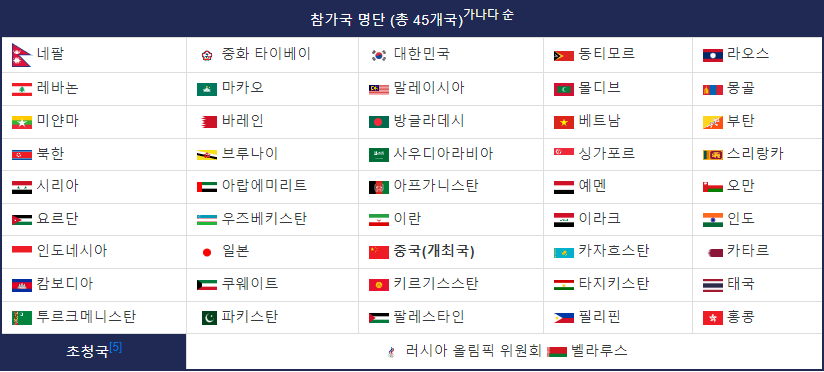 초청국은 정식 메달은 받을 수 없지만, 스포츠 저력이 있는 아시아 지역구 대회에 참가하고자 하는 목적으로 참가하는 것인데요. 국제 올림픽 위원회에서 퇴출당했던 러시아와 벨라루스가 참가하게 된 것에 논란이 있습니다.