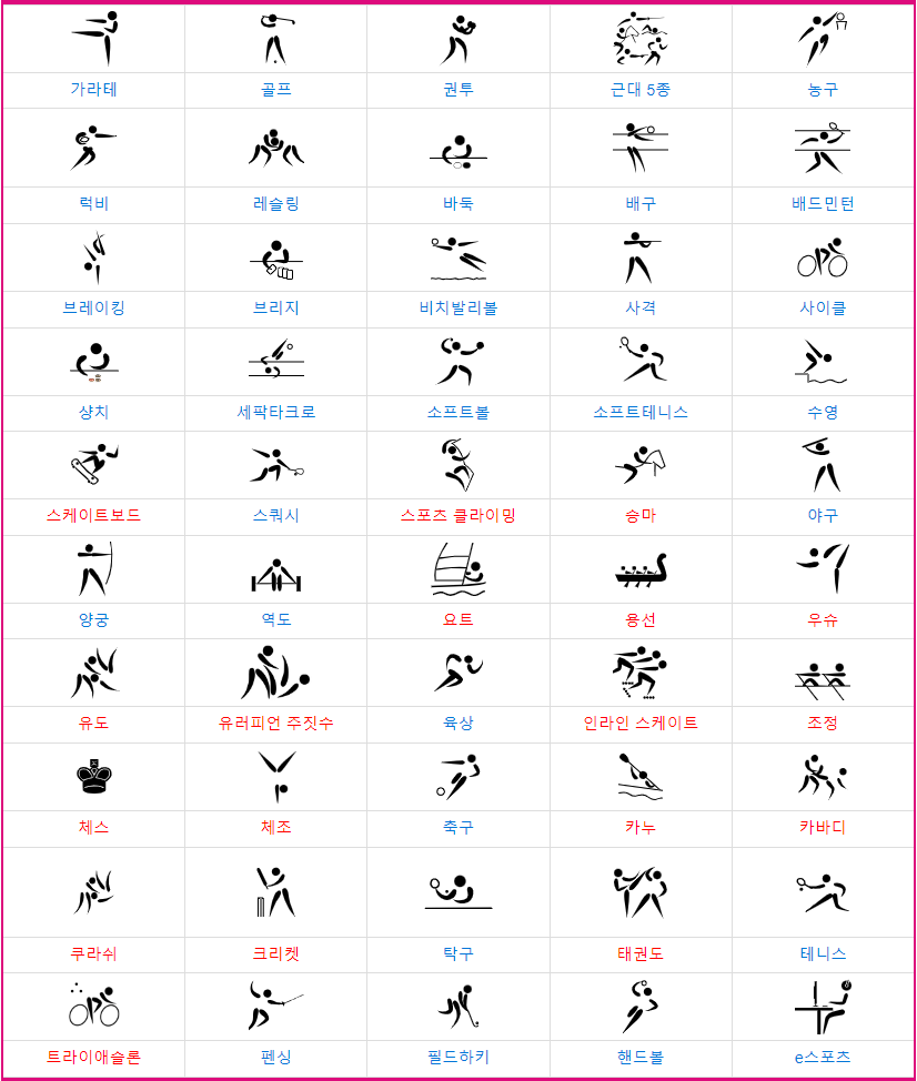 경기 종목은 위의 50가지 중에서 10가지를 뺀 총 40개입니다. 장기간의 경기 침체로 인해 종목 수를 줄였다고 하는데요. 40개의 종목은 다음과 같습니다.