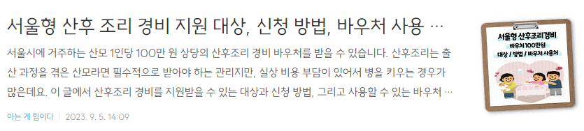 | 서울형 산후 조리 경비 지원 대상, 신청 방법, 바우처 사용 방법 (1) | 2023.09.05 |