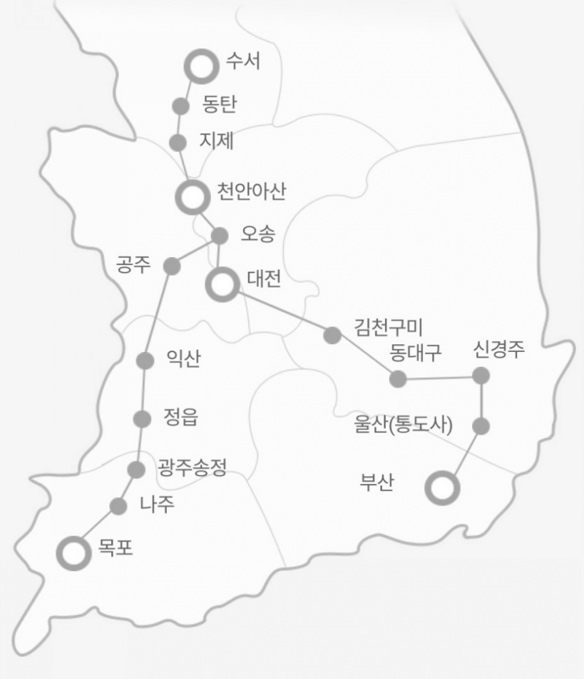 - 부산행 : 오송 - 대전 - 김천구미 - 동대구 - 신경주 - 울산 - 부산
