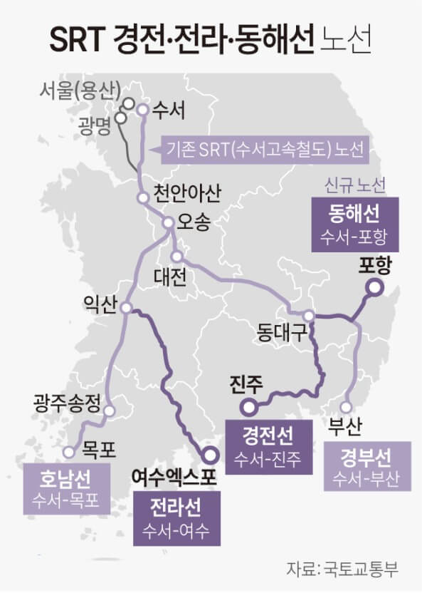 SRT 노선은 기본적으로 크게 2가지 노선으로 나뉩니다. 수서역에서 출발하여 각각 부산 / 목포행입니다.